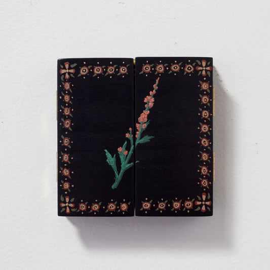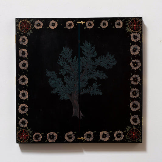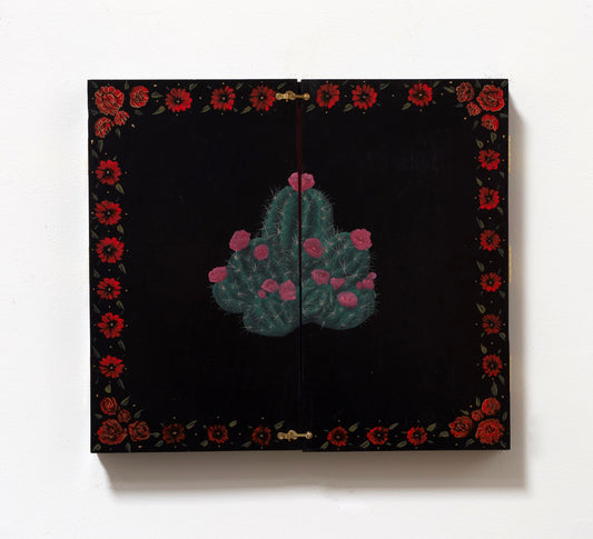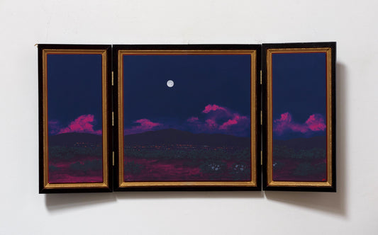 Retablos is a special collection introduced in June 2024. An exploration of the traditional Spanish/Mexican retablo concept. Each piece in this collection of works is designed to be evocative of a small home altar or shrine in reverence to the land and flora of New Mexico. Each retablo is a handmade wooden folding triptych which can be displayed open or closed. Most retablos were created in support of their 2024 debut show, with some being released intermittently since, and a second full show being planned for Summer of 2026.