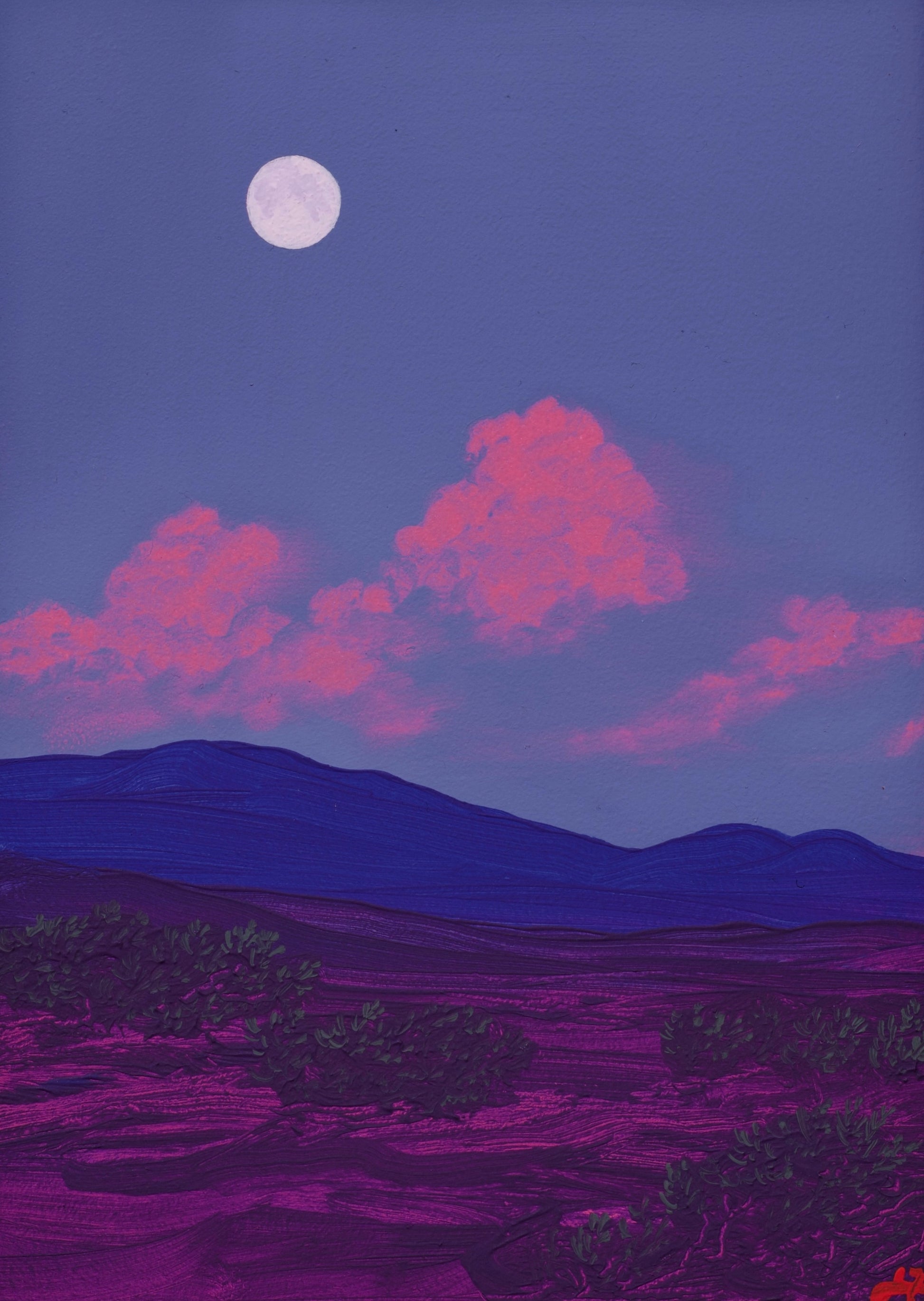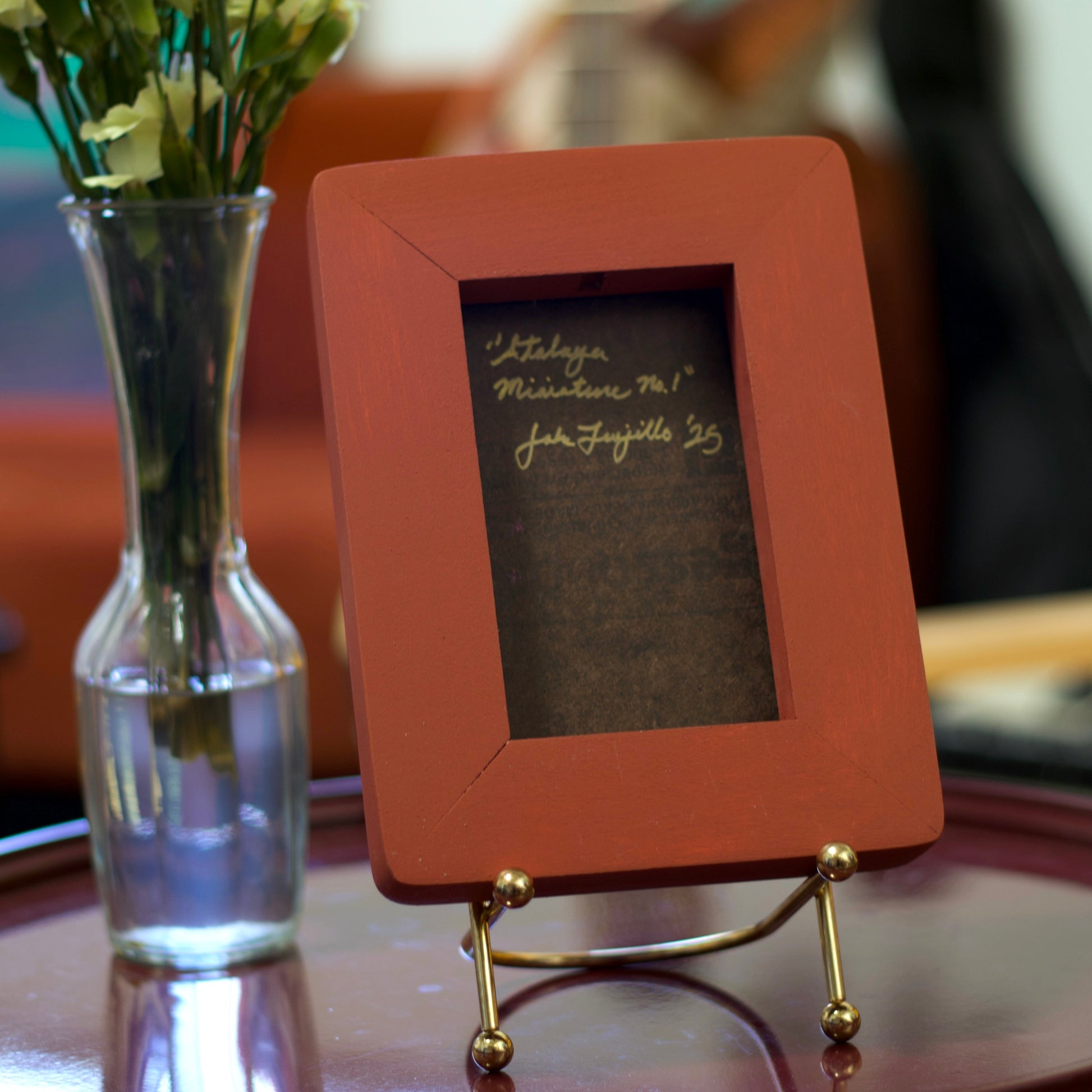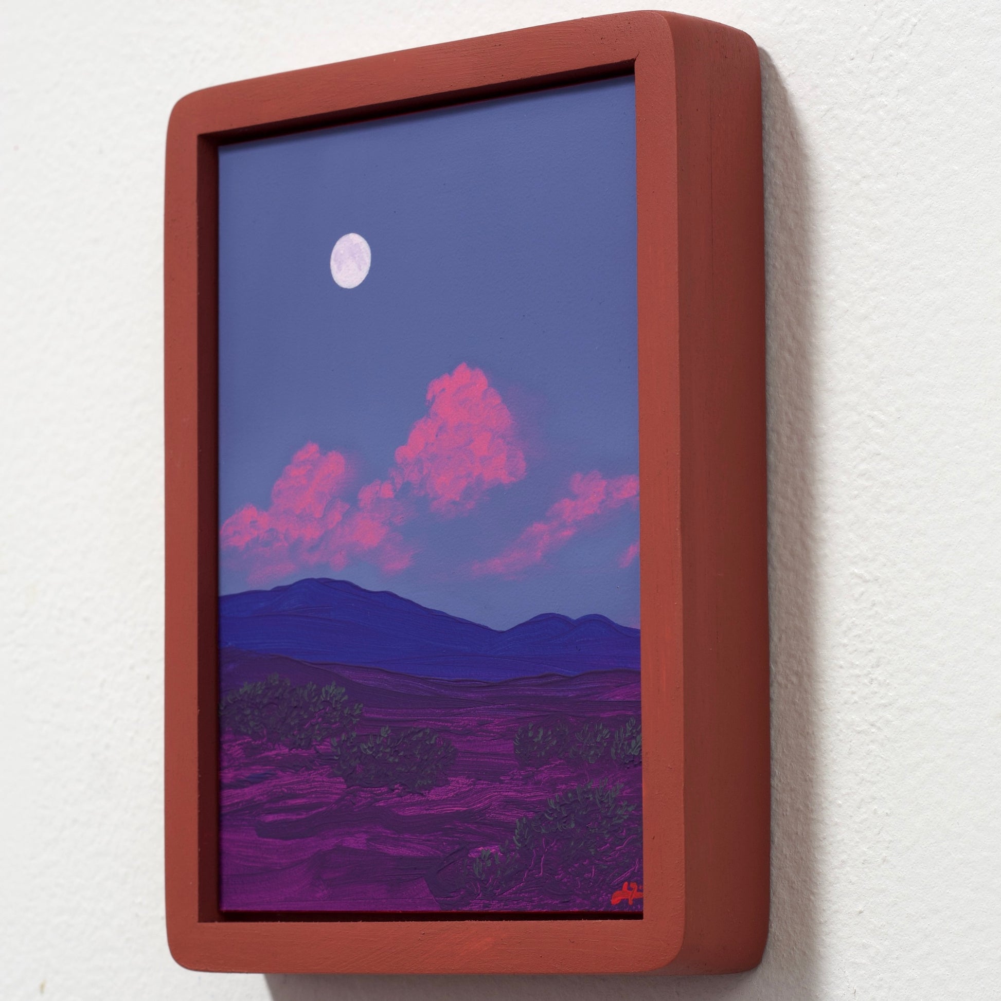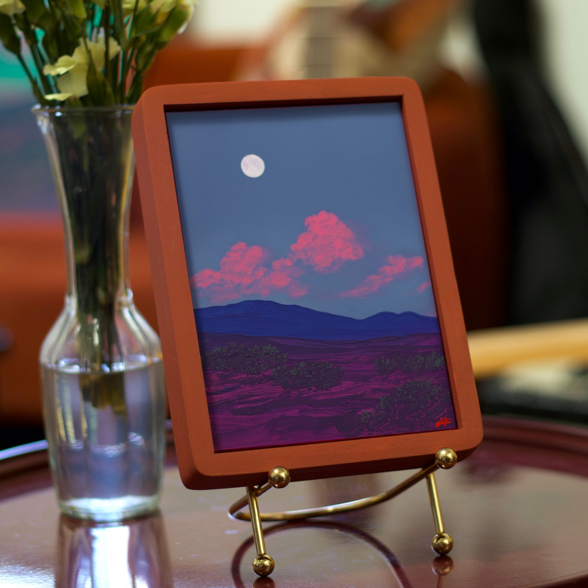 Oil paint over acrylic gesso on masonite finished with matte varnish. 5 x 7 inch masonite panel in a handcrafted wood frame finished with terra cotta colored acrylic paint and a durable topcoat. With the frame the piece is ~6 x 8 inches, and has a carved slot in the reverse of the frame for easy hanging.