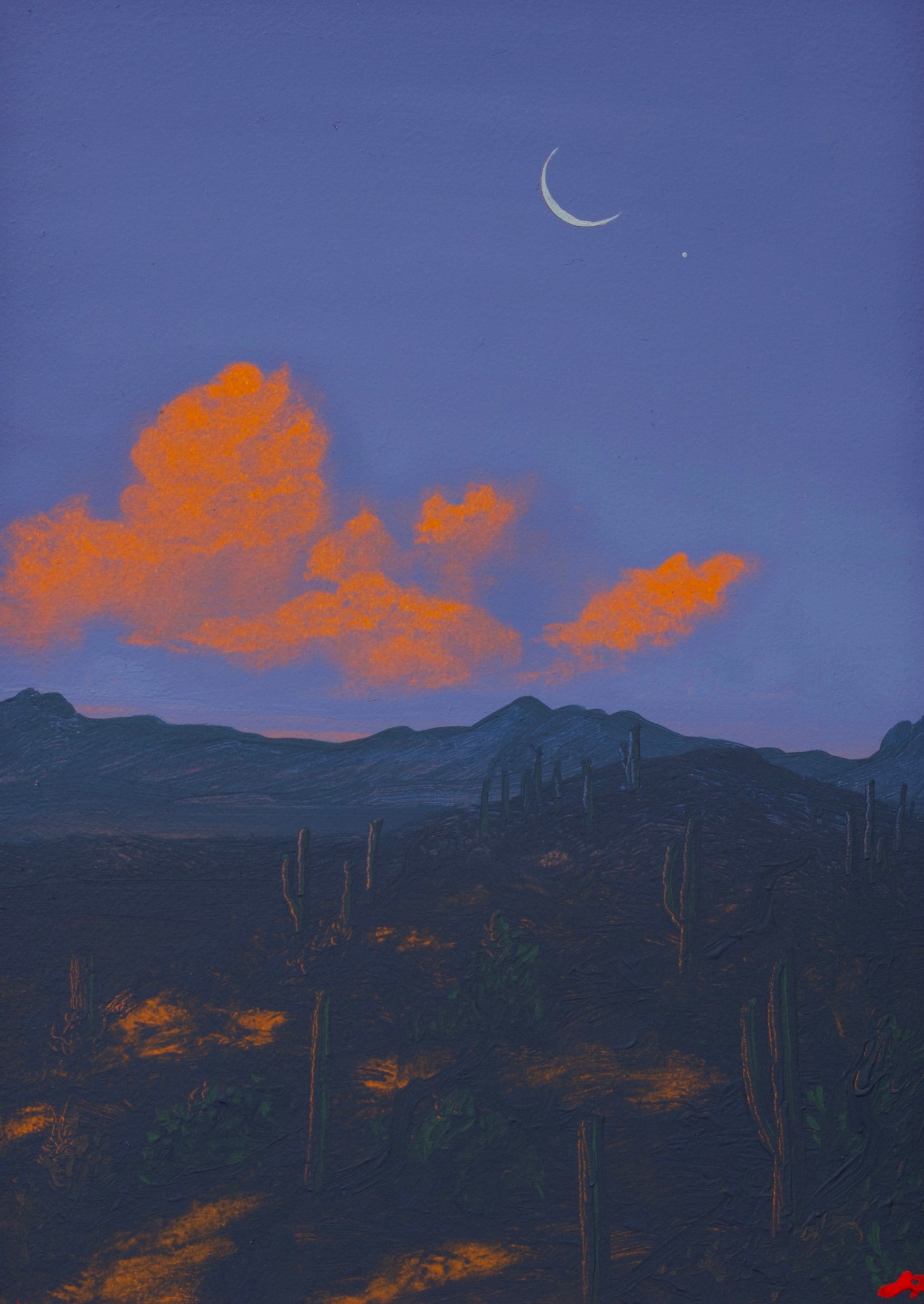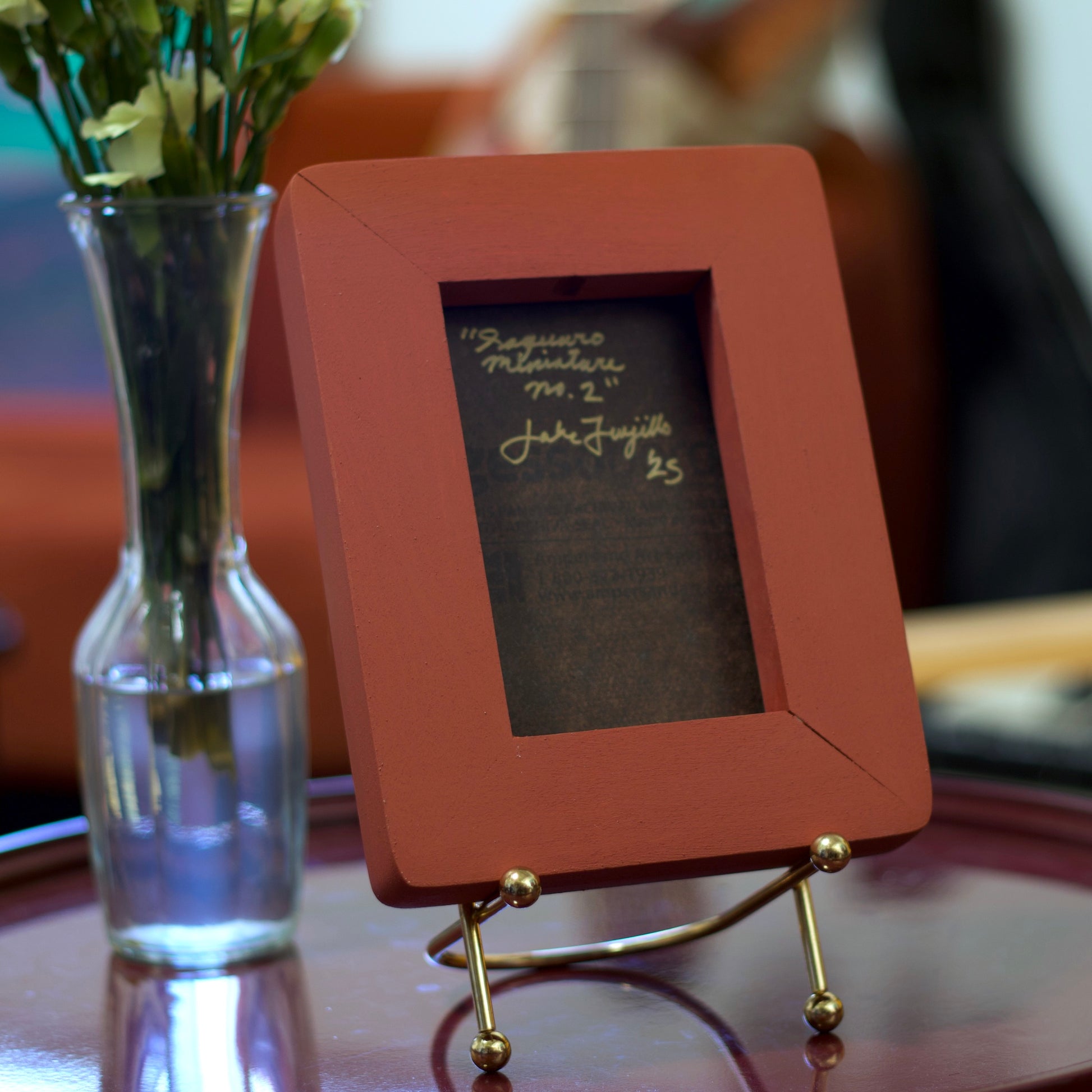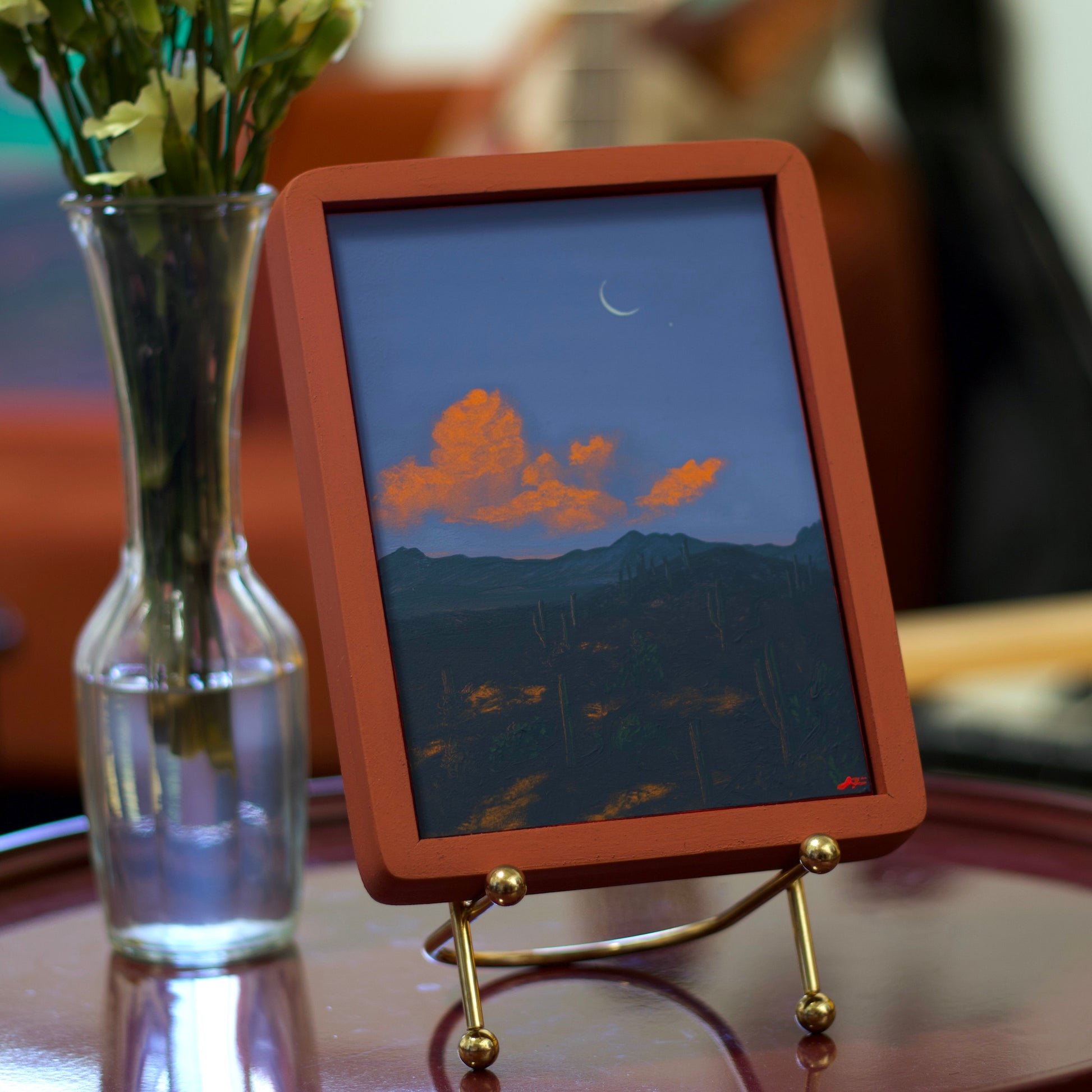 Oil paint over acrylic gesso on masonite finished with matte varnish. 5 x 7 inch masonite panel in a handcrafted wood frame finished with terra cotta colored acrylic paint and a durable topcoat. With the frame the piece is ~6 x 8 inches, and has a carved slot in the reverse of the frame for easy hanging.